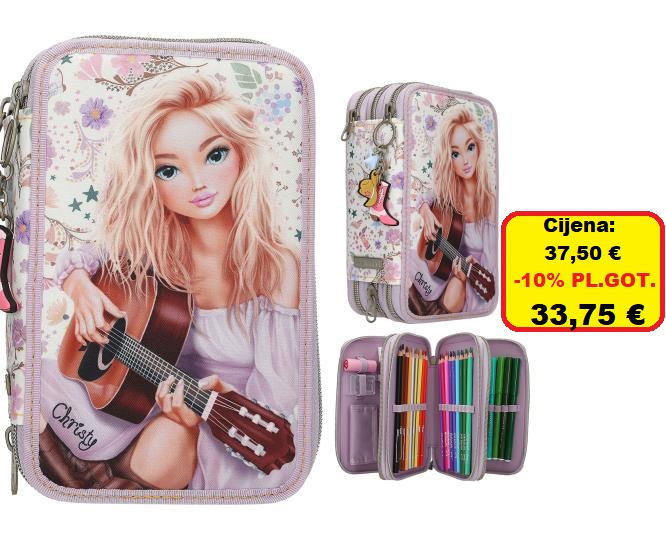 TOP MODEL pernica za olovke ima veliki romantični motiv modela s gitarom na prednjoj strani. Sve ukrašeno prekrasnim, nježnim uzorkom malih cvjetova, lišća, zvijezda i kaubojskih čizama. Slatki dodatak: etiketa s patentnim zatvaračem sa šarenim kaubojskim šeširom, kaubojskim čizmama i zvijezdom. Tri odvojena pretinca pernice u potpunosti su ispunjena: