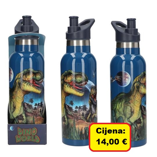 Opasno cool: Plava boca za piće od nehrđajućeg čelika marke Dino World ima odličan motiv sa svih strana s dva grabežljiva dinosaura i dva leteća dinosaura na galaktički genijalnoj pozadini s velikim planetima. S praktičnom ručkom i čepom za piće.