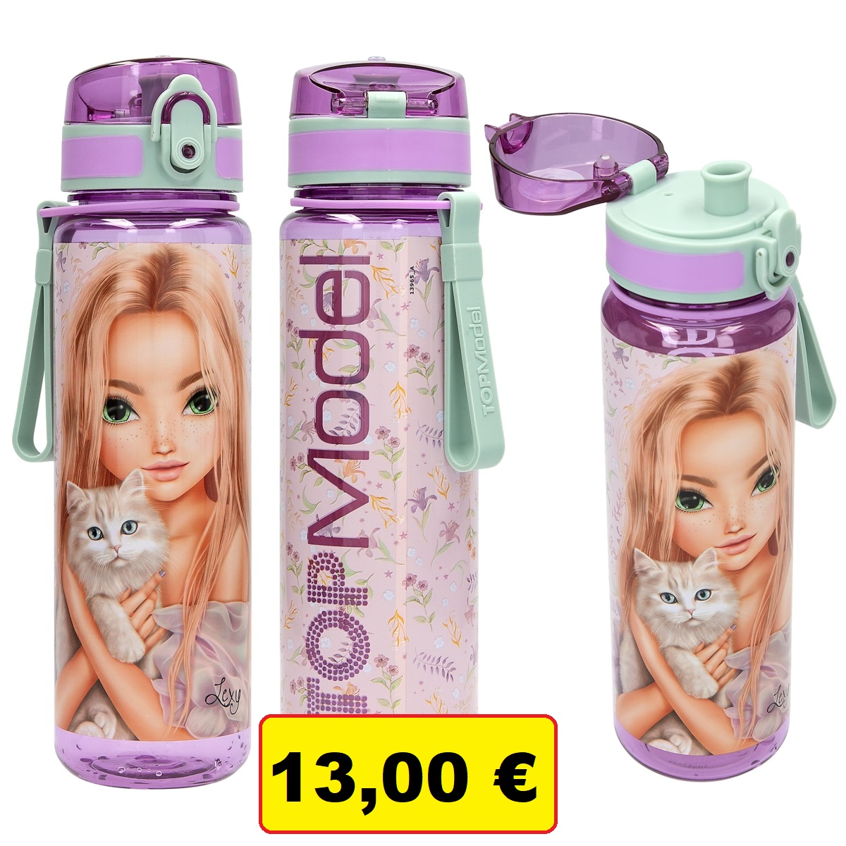 • Ljubičasta prozirna TOPModel boca za piće ima veliki motiv modela s mačkom i slatkim, nježnim cvjetnim uzorkom sa svih strana. Praktični poklopac na preklop u ljubičastoj i kaduljasto zelenoj boji sa silikonskom petljom omogućuje otvaranje i zatvaranje jednom rukom. Zbog raskošnog tiska, boca za piće nije prikladna za pranje u perilici posuđa ili mikrovalnoj pećnici.