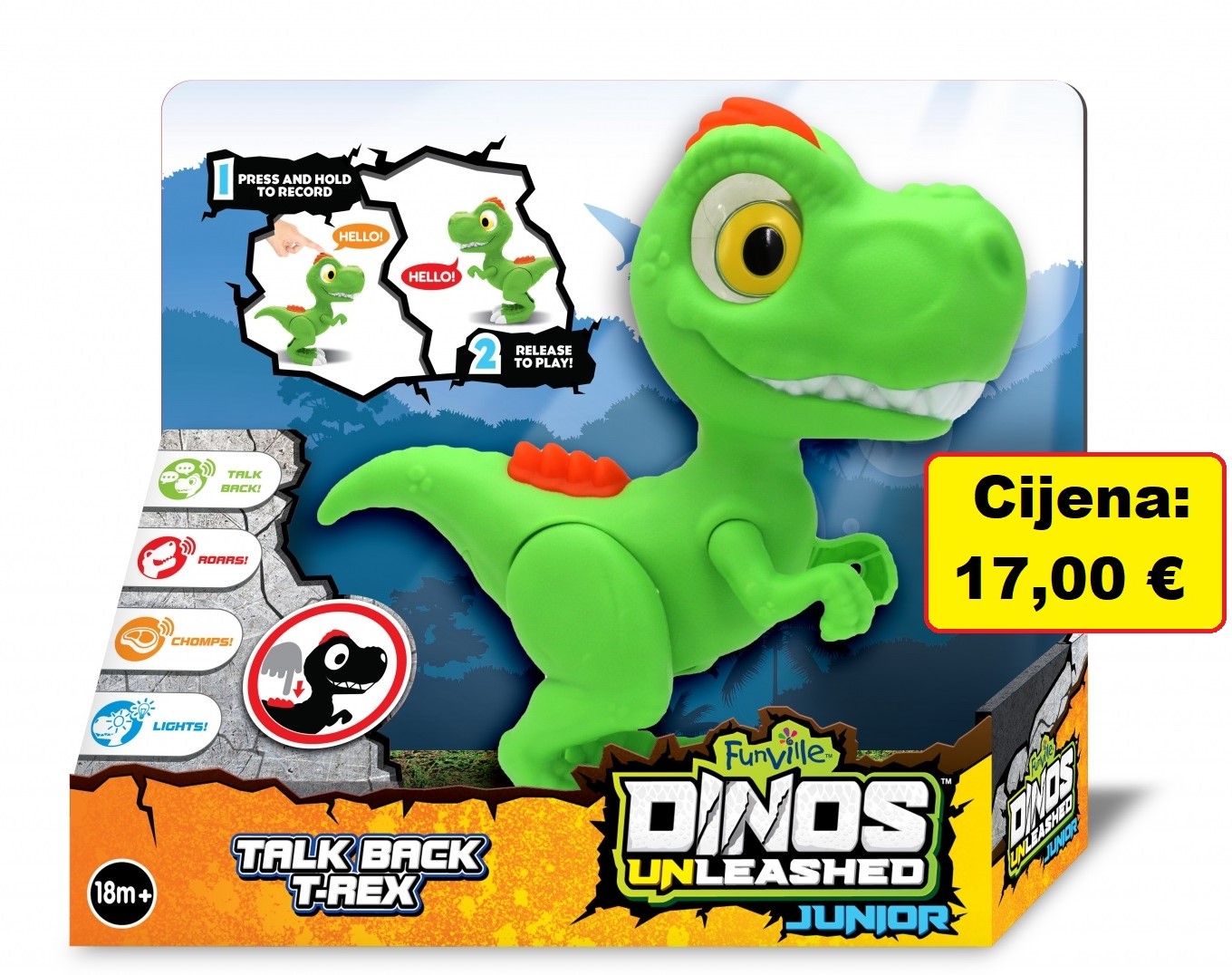 Dinos Unleashed T-Rex simpatičan je dinosaur koji govori te ispušta urlike i druge zabavne zvukove! Pritiskom na njegovu jarko narančastu krestu snimite vlastite poruku, a T-Rex će ju ponoviti izmijenjenu iznenađujućim efektima! Uz svjetleće oči i zvučne efekte koji se aktiviraju pritiskom na skrivene tipke ili pokretanjem dinosaurovih nogu, maleni ljubitelji prethistorijskih stvorenja će s oduševljenjem otkrivati kakva sve iznenađenja skriva Dinos Unleashed T-Rex koji govori.