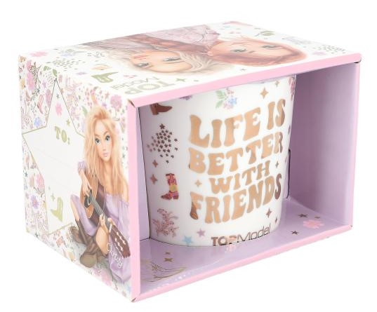 Ova šalica marke TOPModel donosi pravi kaubojski osjećaj na stol. S jedne strane ima dvostrani dizajn modela, a s druge pozlaćeni natpis ("Život je bolji s prijateljima"). Mali motivi poput cvijeća, kaubojskih čizama, kaubojskog šešira i zvijezda krase stranice. Sadrži 300 ml vašeg omiljenog pića i dolazi pakirana u visokokvalitetnoj poklon kutiji. Napomena: Zbog zlatnog otiska, ova šalica nije prikladna za mikrovalnu pećnicu i treba je prati ručno. Materijal: Novi porculan od kostiju.