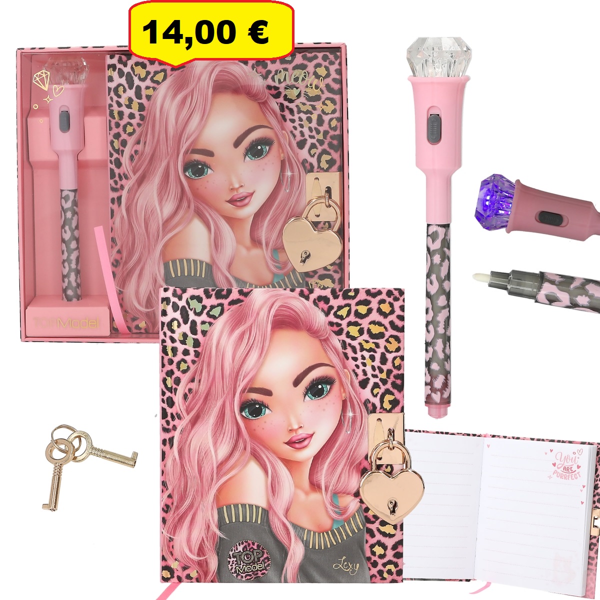 TOP MODEL set za tajne misli i tajne: Dnevnik u šarenom leo izgledu s cool motivom modela ima slatku bravu u obliku srca s dva ključa i fino liniranim stranicama s unutarnje strane. Odgovarajuća olovka piše nevidljivom tintom koja postaje vidljiva tek kada je osvijetljena UV svjetlom dijamantnog nastavka. Novo: Baterije u olovci su zamjenjive