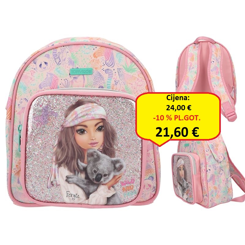 TOPModel ruksak u nježnoj ružičastoj boji ima suptilno šaren, veseo životinjski uzorak i prednji džep potpuno obložen svjetlucavim s motivom simpatičnog modela koale. Oba pretinca imaju patentni zatvarač, a naramenice su podesive po duljini.