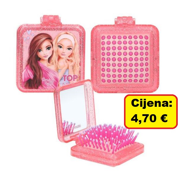 Mala sklopiva četka za kosu marke TOP MODEL s ogledalom. Savršeno stane u džep ili torbu. Prozirno ružičasta  s efektom šljokica