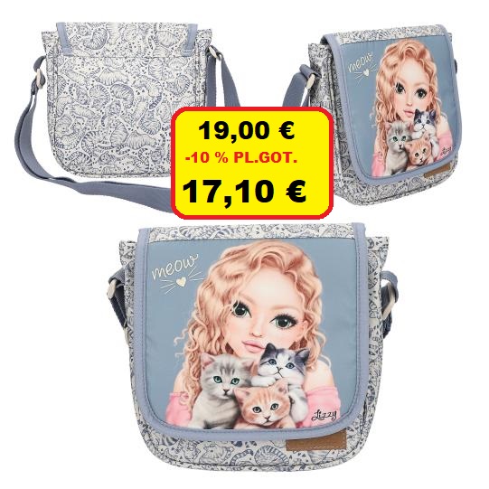 Ljubav prema mačkama: mala svijetloplava i krem ​​torba za rame marke TOPModel ima veliki motiv modela s tri slatka mačića na prednjoj strani i prekrasan uzorak mačaka po cijeloj površini. Remen za rame podesiv je po duljini. Materijal: 100% poliester
