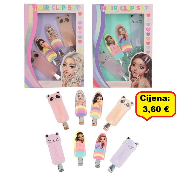 Postoje 2 seta: 2 Top Model kopče u ljubičastoj i narančastoj boji plus 2 panda kopče u prozirnoj boji marelice i ružičastoj sa svjetlucanjem, sve sa zlatnim metalom. 2 Top Model kopče u žutoj i ružičastoj boji plus 2 mačkaste kopče u prozirnoj bijeloj i ružičastoj boji sa svjetlucavim sjajem, sve sa srebrnim metalom