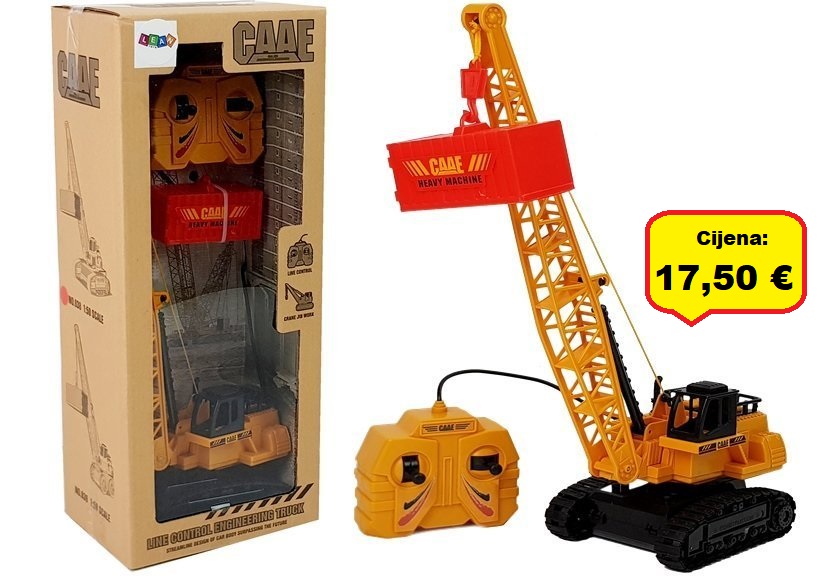 Dizalica (kran) na daljinsko upravljanje. Vaš će mališan moći sjediti za komandama ogromnog građevinskog stroja izrađenog u mjerilu 1:50. Dizalica je izrađena u bojama tipičnim za građevinske strojeve. RC dizalica na daljinsko upravljanje CAAE ima gumene gusjeničaste kotače koji se na pravom gradilištu mogu nositi s različitim površinama. U setu se nalazi kontroler koji se na auto spaja kablom dužine 110 cm. Na kraju ruke nalazi se kuka na koju možete pričvrstiti i prenijeti na drugo mjesto crveni spremnik.