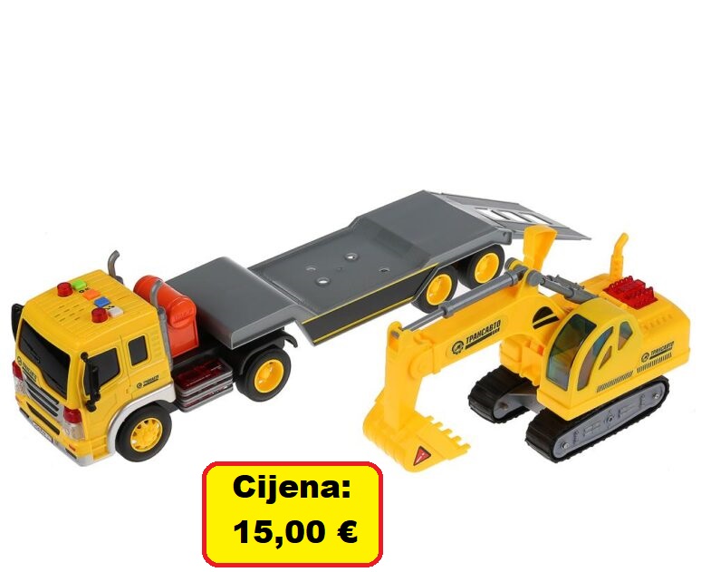 Kamion s prikolicom na ravnoj platformi pokreće se trenjem pa će se kretati kada ga kotrljate. Dobro se igrati i u zatvorenom i na otvorenom.