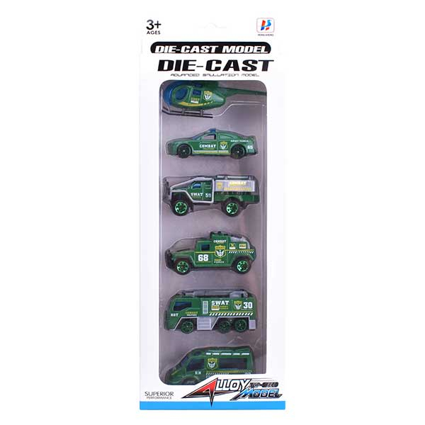 Set uključuje vojni helikopter, auto, terensko vozilo, kamion, kombi i džip.