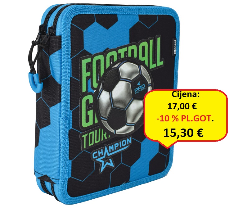 2 zipa; sadrži 48 komada pribora: flomaster školski 18 boja, boje drvene 18 boja, olovka grafitna HB x 2 komada, šiljilo, gumica, ravnalo pvc, olovka kemijska trobojna, olovka tehnička 0,5 mm, mine 0,5 mm, olovka kemijska, trokut pvc, škare školske i raspored sati obostrani; dimenzija: 23x20x5 cm