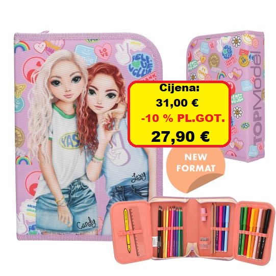 Batch bum! Ružičasta TOPModel pernica ima veliki dvostruki motiv modela na prednjoj strani i super cool šarene šarene printove posvuda.