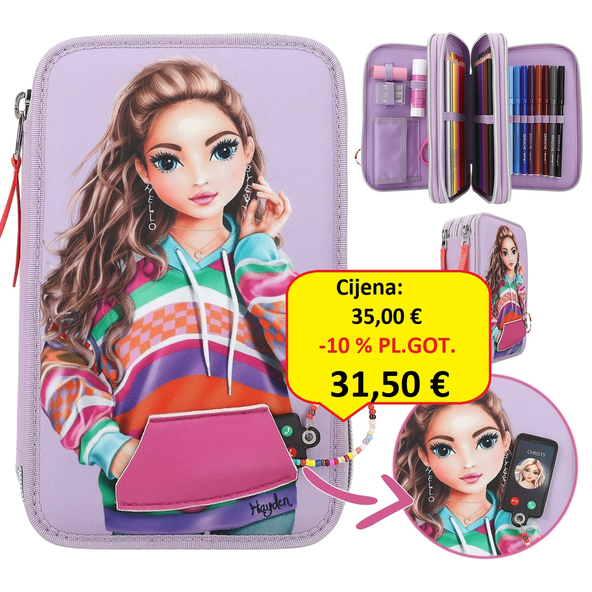 Magnet omogućuje stavljanje mobitela u ruku modela radi telefoniranja. Tri odvojena pretinca pernice potpuno su ispunjena sa 18 boja i