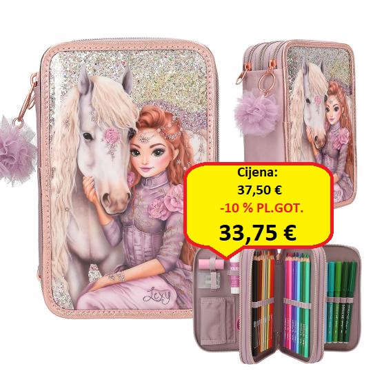 Viva Violet: TOP Model pernica u tamnoljubičastoj boji ima veliki motiv modela sa prekrasnim konjem na svjetlucavoj prednjoj strani. Otmjeni, cvjetni privjesak od tila visi na patentnom zatvaraču. Svaki od tri odvojena odjeljka u potpunosti je opskrbljen s 18 boja i markera, 2 olovke, gumicom, šiljilom, ravnalom, škarama, štapićem ljepila i malom torbicom na čičak. Materijal: 100 posto PES; PVC na prednjoj strani
