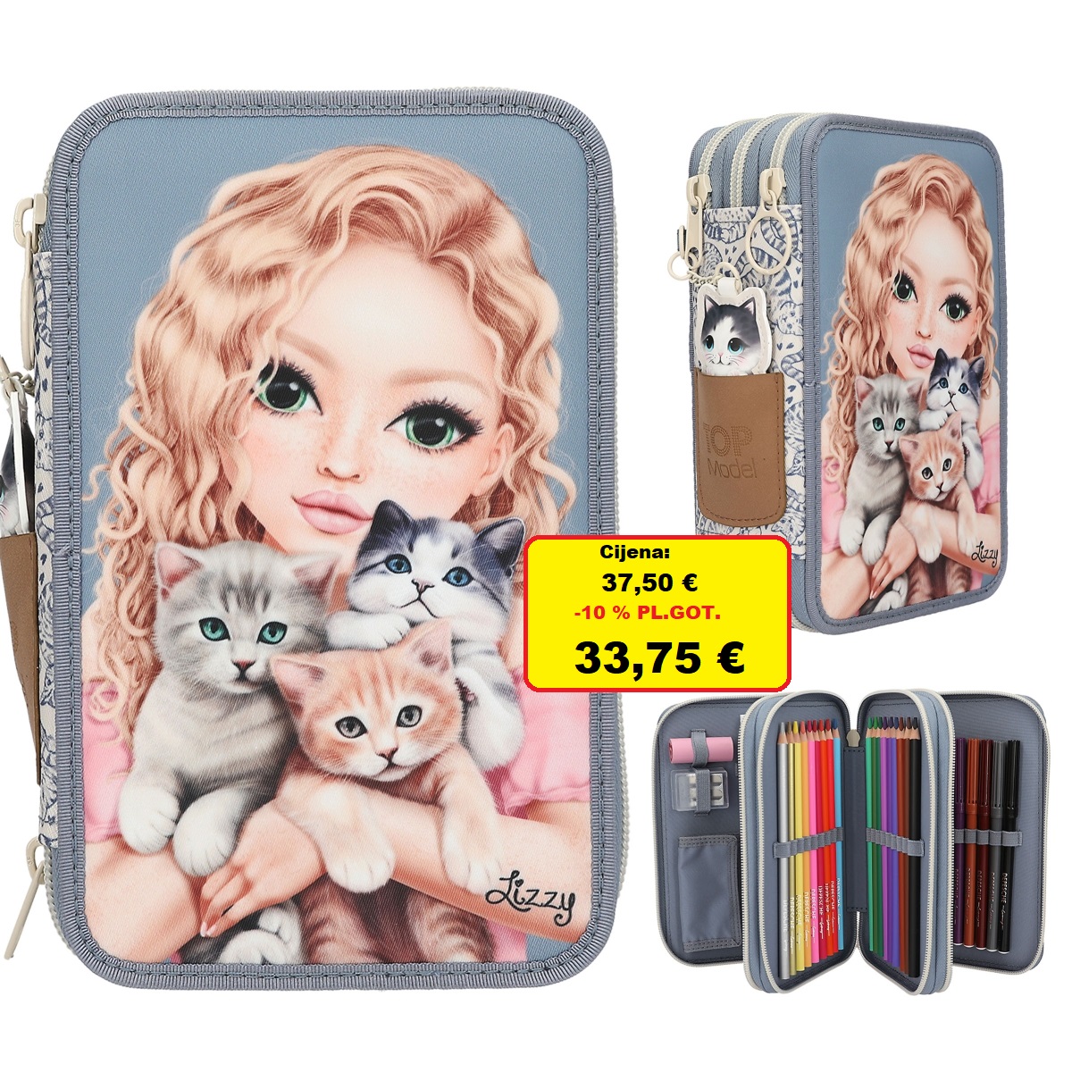 Ljubav prema mačkama: svijetloplava i krem ​​pernica iz TOPModela ima veliki motiv modela s tri mačića na prednjoj strani i slatki mačji uzorak posvuda okolo. Slatki bonus: privjesak mačka, koji se može staviti u mali džep sa strane. Svaki od tri odvojena odjeljka potpuno je ispunjen s 18 boja i flomastera, 2 olovke, šiljilom, gumicom, ravnalom, škarama, ljepljivim štapićem i malom torbicom na čičak. Materijal: 100 posto poliester