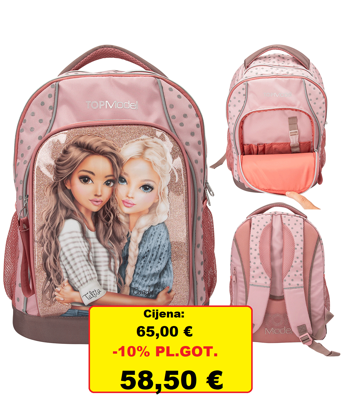 • Ergonomski ispravan, lagan i stvarno lijep školski ruksak iz TOPModel DOTS serije s finim točkastim detaljima i velikim motivom TOPModels Talita i Candy na metalik glitter pozadini na prednjem džepu. Školski ruksak je podijeljen u 2 velika pretinca s puno prostora za knjige, bilježnicu, kutiju za ručak i pernicu te ima bočne džepove za, između ostalog, bocu za piće i nekoliko džepova i pretinaca za, na primjer, novac, ključeve, putne kartice itd. Torba je također opremljena s mnogo lijepih, praktičnih i ergonomski ispravnih detalja kao što su mekane i podesive naramenice, podstavljena i prozračena leđa, uz reflektirajuće dijelove, jak remen za nošenje, izdržljiv materijal, dno otporno na prljavštinu i vodu i mnogi drugi detalji. Uključujući veliki privjesak s patentnim zatvaračem od tkanine s tekstom BEST FRIENDS. Savjet: Personalizirajte svoj ruksak dodavanjem više privjesaka u veliki prsten s patentnim zatvaračem.