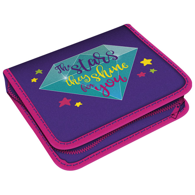 pernica puna; 1 zip, 2 preklopa; sadrži 33 komada pribora: flomaster školski 12 boja, boje drvene trokutaste 12 boja, olovka grafitna HB x 2 komada, šiljilo, gumica, ravnalo pvc 17 cm, olovka kemijska trobojna, olovka tehnička 0,5 mm grip, mine 0,5 mm, olovka kemijska grip i raspored sati x 2 komada