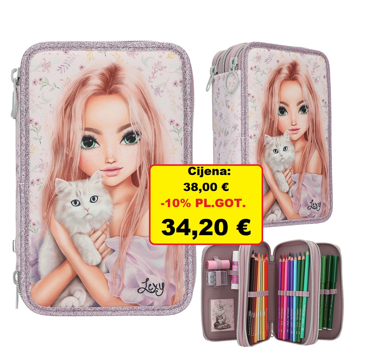 Ružičasta pernica ima veliki motiv mačke na prednjoj strani, nježan cvjetni uzorak po rubovima i ljubičasti obrub sa šljokicama. Zatvarač je boje kadulje, a jedan je u obliku prstena za pričvršćivanje privjesaka. Tri odvojena pretinca pernice u potpunosti su ispunjena s 18 bojica i flomastera, 2 olovke, šiljilom, gumicom, ravnalom, ljepilom u stiku, škarama i malom torbicom na čičak.