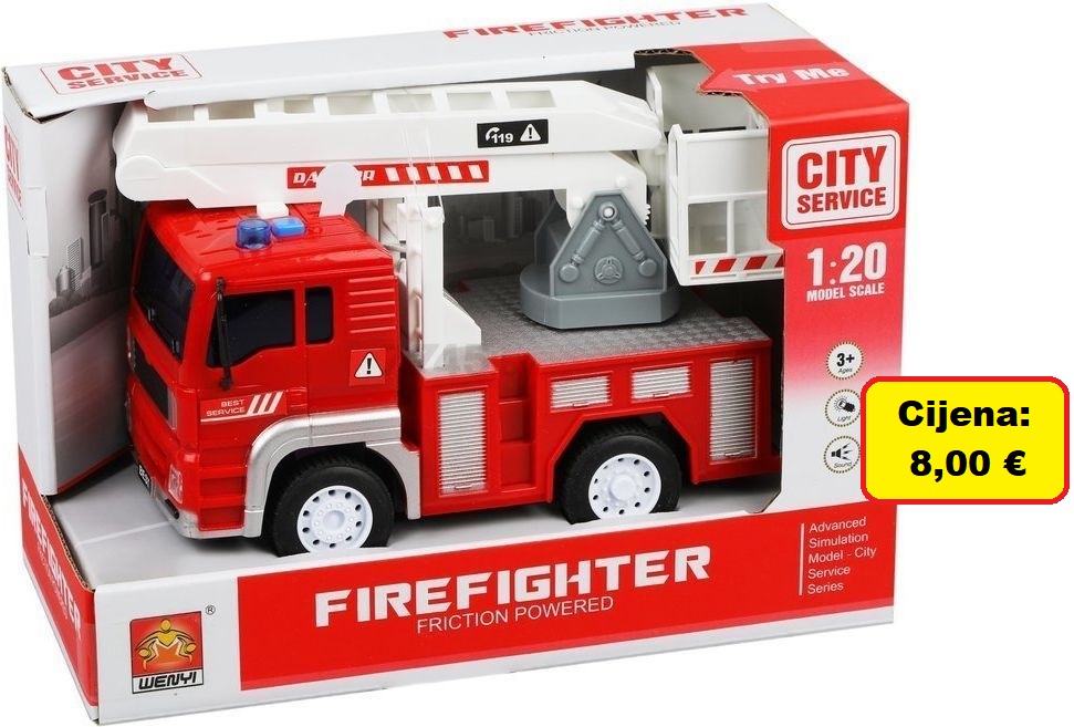 Vatrogasno vozilo na povlačenje je vrlo detaljan model s pomičnom dizalicom koja se može podešavati po visini i rotirati. Igračka ima integrirane svjetlosne i zvučne efekte kako bi se igrač potpuno uronio u igru. Motor na povlačenje omogućuje vozilu da samostalno prijeđe određenu udaljenost.