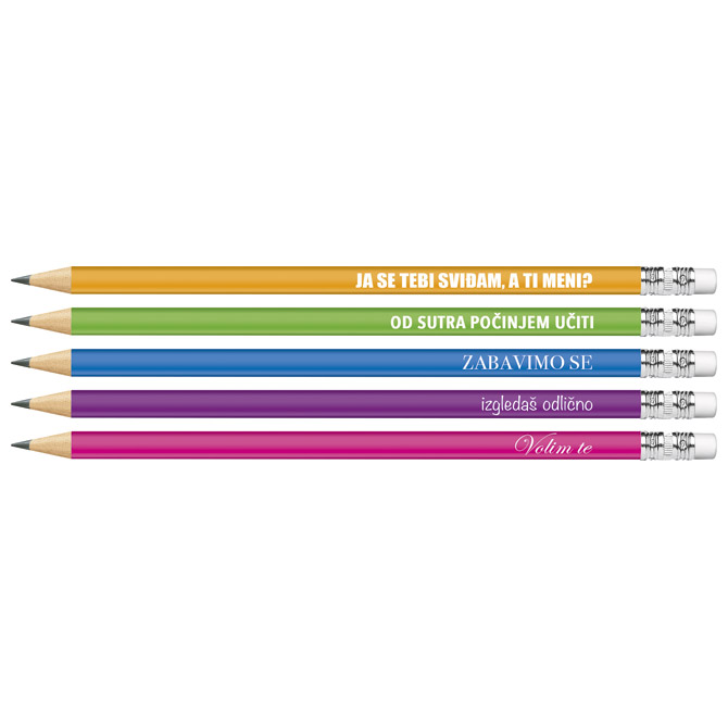 tvrdoća: HB; šiljena; s gumicom i natpisom