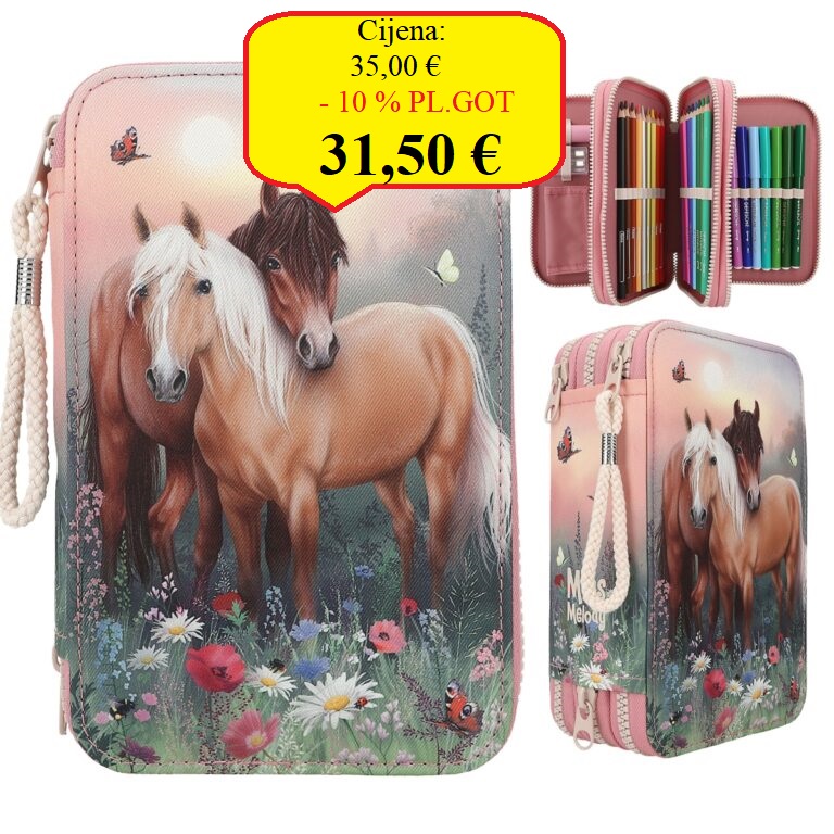 Pravo more cvijeća, veličanstveni smeđi konji i ružičasti odvojeni pretinci ispunjeni sa 18 olovaka u boji i 18 flomastera, 2 olovke, šiljilo, gumica, ravnalo, škare, štapić ljepila i mala torbica s čičak kopčom.