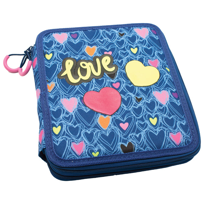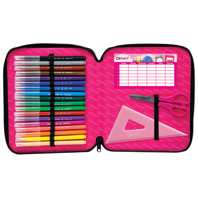 2 zipa; sadrži 48 komada pribora: flomaster školski 18 boja, boje drvene 18 boja, olovka grafitna HB x 2 komada, šiljilo, gumica, ravnalo pvc, olovka kemijska trobojna, olovka tehnička 0,5 mm, mine 0,5 mm, olovka kemijska, trokut pvc, škare školske i raspored sati obostrani; dimenzija: 23x20x5 cm