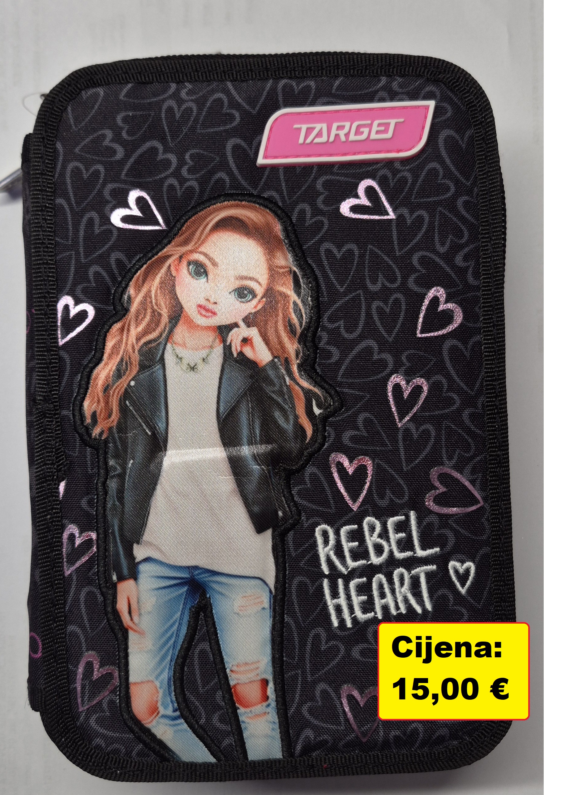 Unutra sadrži kvalitetne šolske potrepštine, među kojima su boje, flomasteri, olovke, kemijska olovka, gumica, šiljilo, ravnalo, škare i ljepilo stick. Zbog preglednog rasporeda u tri zatvarača, pribor je brzo dostupan i lijepo pospremljen.