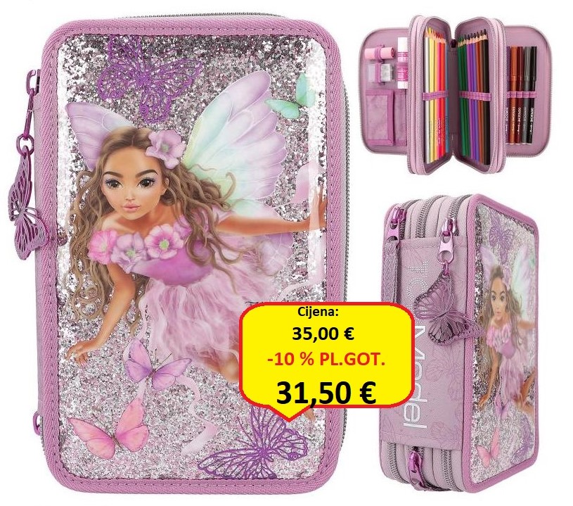 Bajkovito-fantastično! Trostruka pernica TOPModel ljubičaste boje ima potpuno svjetlucavu prednju stranu s maštovitim motivom modela vile. Lepršaju posvuda: nježni otisci leptira. Lijep bonus: svjetlucavi metalni leptir na patentnom zatvaraču. .
