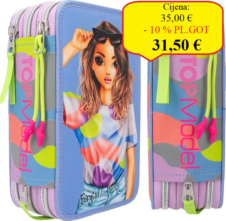 Crazy cool: pernica s 3 odjeljka iz TOPModela ima veliku sliku modela na ljubičastoj prednjoj strani i trendovsku grafičku sliku od reflektirajućeg
