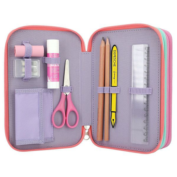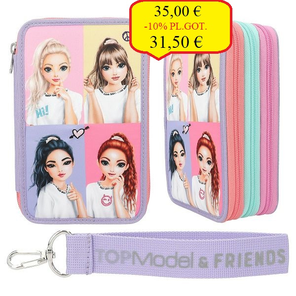 Super fotografije TOPModel: ljubičasta TOPModel trostruka pernica Snap Shots ima četiri šarena motiva modela na prednjoj strani, kao i male,