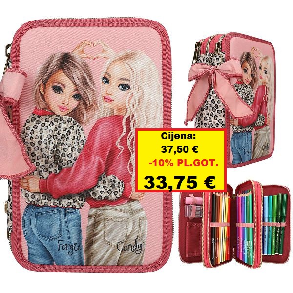 Ružičasta pernica Leo Heart ima veliki dvostruki motiv modela na prednjoj strani i genijalan leopard uzorak sa strane i straga. Veliki ružičasti privjesak s mašnom na patentnom zatvaraču apsolutno privlači poglede. Tri odvojena pretinca u potpunosti su ispunjena s 18 bojanica i flomastera, 2 olovke, ravnalom, gumicom, šiljilom, ljepilom u stiku za škare i malom torbicom na čičak.