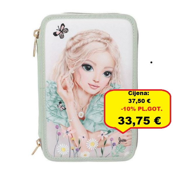 Trostruka pernica kadulje zelene boje TOPModel ima veliki romantični motiv modela na prednjoj strani s nježnim cvjetovima i leptirima, od kojih su neki izvezeni