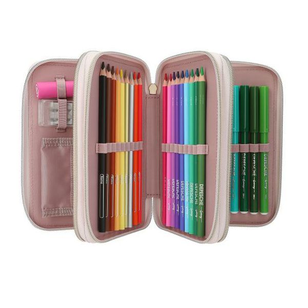 Svaki od tri odvojena pretinca potpuno je ispunjen sa 18 boja i flomastera, 2 olovke, šiljilom, gumicom, ravnalom, škarama, ljepljivim štapićem i malom torbicom na čičak.