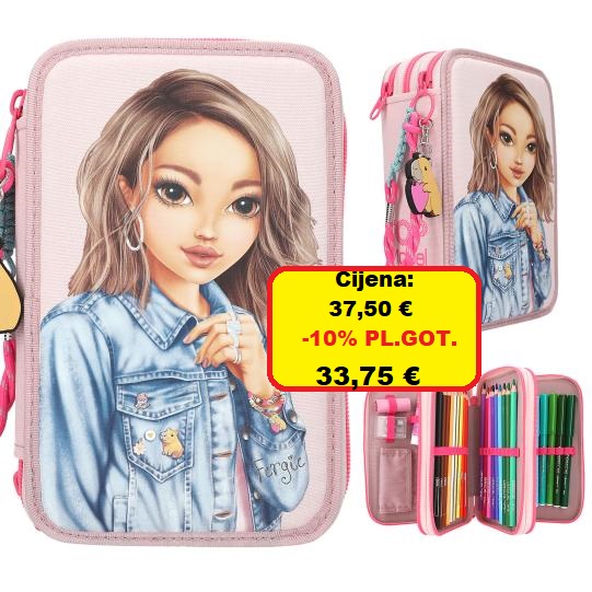 Traperice s ružičastom su uvijek top! Ružičasta TOPModel pernica s ružičastim patentnim zatvaračima ima veliki motiv modela s ležernom traper jaknom na prednjoj strani. Slatki dodatak: privjesak kapibare i šarene vrpce na zatvaraču. Tri odvojena pretinca ispunjena su s 18 flomastera i bojica, 2 olovke, šiljilom, gumicom, ravnalom, škarama, ljepilom u stiku i malom vrećicom na čičak. Glavni materijal: 100% poliester