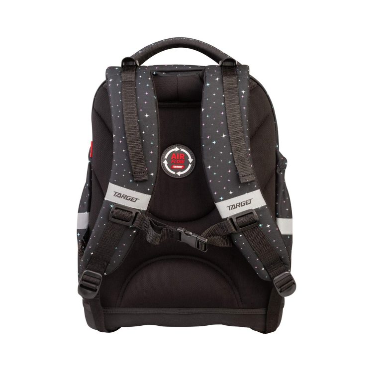 Ergonomski oblikovan leđni dio omogućava protok zraka. Anatomski oblikovane široke naramenice ; remenčići za podešavanje; tvrda podnica, koja kod nošenja čuva knjige od oštećenja; snažno reflektirajući, sigurnosni dijelovi; izrađen je od materijala koji odbija vodu; veliki pretinci za knjige; pretinci na bočnim stranama za bočicu.