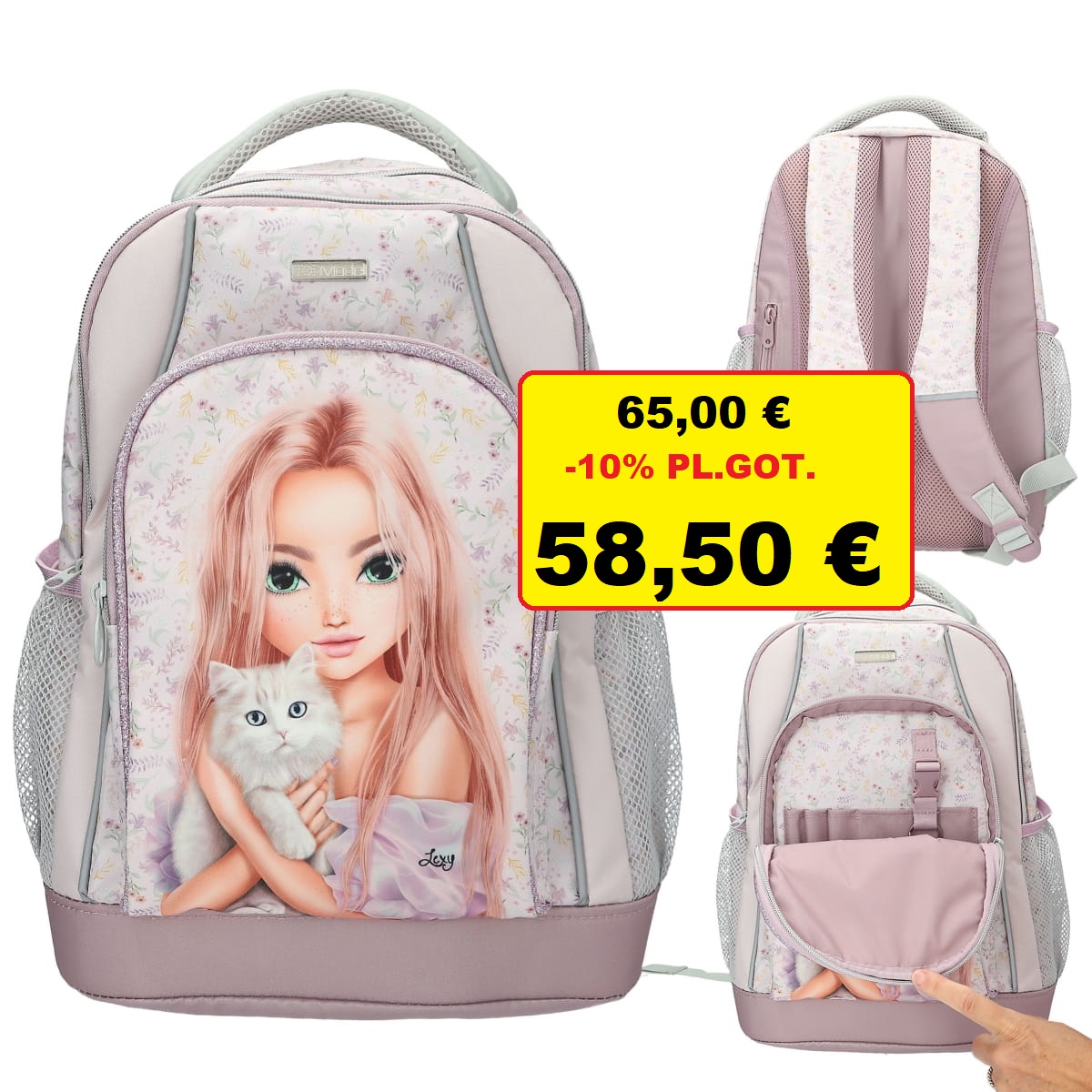 Školski ruksak TOPModel u svijetloj ljubičastoj boji ima veliki motiv mačke i nježan cvjetni uzorak sprijeda te podesive naramenice. S ljubičastim šljokicama i detaljima boje kadulje, podstavljenom leđima, vodootpornom i neklizajućom podlogom, bočnim mrežastim džepovima, reflektorima, prednjim i glavnim pretincem te ručkom za nošenje. Glavni materijal: 100 posto poliester