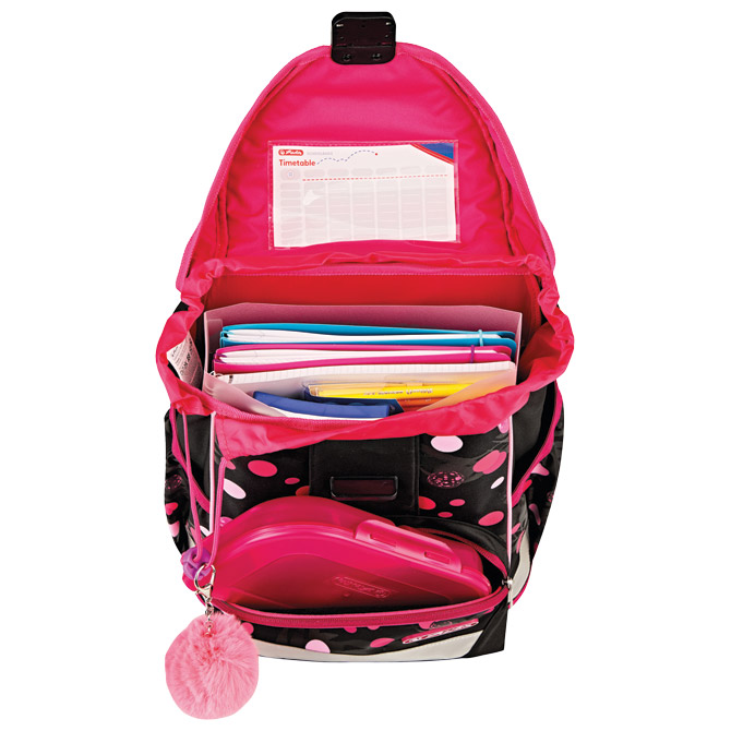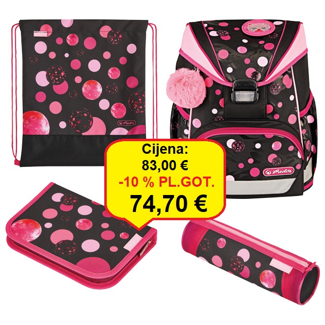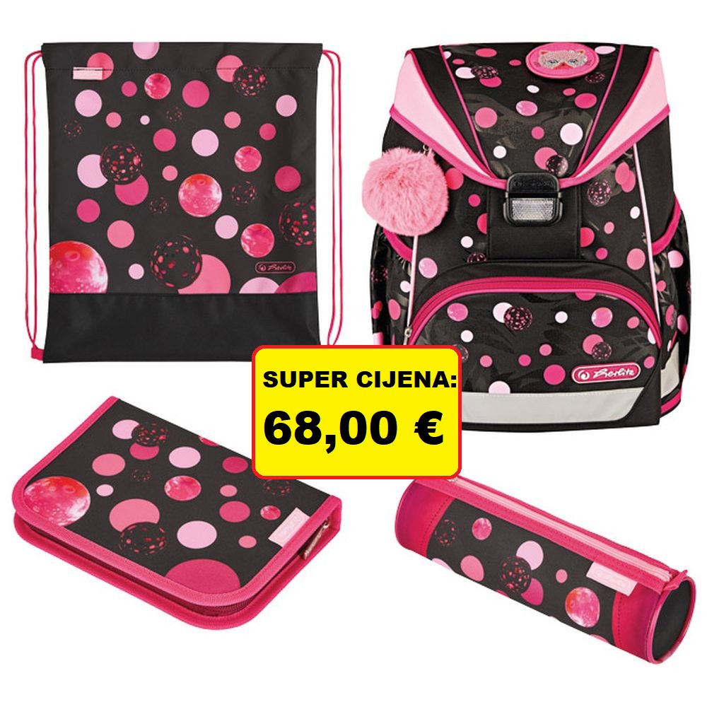sadrži: torbu školsku (iznimno lagana; dimenzija: 28x36x21 cm; težina: 750 g; kapacitet: 15 l; anatomska; ergonomski oblikovan leđni dio omogućava protok zraka; podesive naramenice; remenčići za podešavanje; kopča na klik; snažno reflektirajući, sigurnosni dijelovi; džepić na zip s prednje strane; džepovi na bočnim stranama; na poklopcu ima motiv na čičak koji se može mijenjati); vrećicu za tjelesni, pernicu punjenu sa 16 komada pribora i pernicu vrećicu okruglu